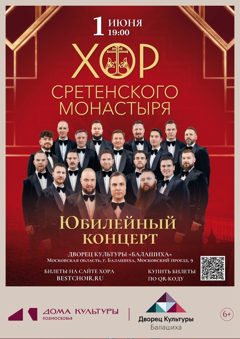 1 июня 2026 года в Балашихе состоится Юбилейный концерт Хора Сретенского монастыря, приуроченный к 30-летию коллектива. Соборный образ российской певческой культуры соединит времена и народы, прошлое и будущее великой страны. Сегодня духовная музыка и песни военной поры воспринимаются не как бесценные исторические, художественные памятники минувших времен, но и приобретают значение живого, действенного элемента современности. Миссия Хора — хранить духовные традиции и песенную культуру России, поэтому в концерте прозвучат уникальные образцы духовной музыки и любимые песни, которые так полюбились публике.