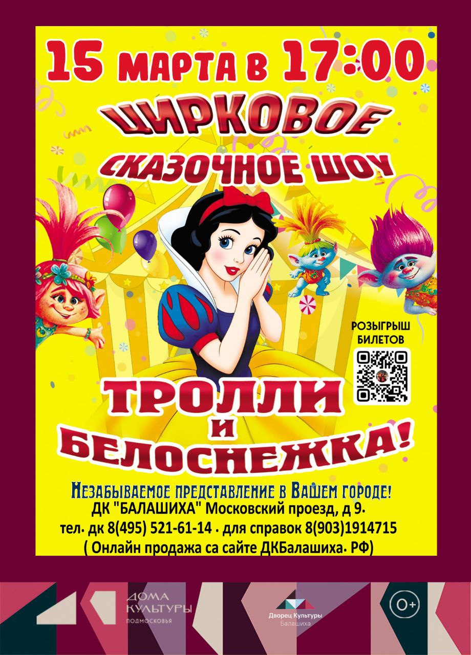 За основу театрально-циркового шоу «Тролли и Белоснежка» взяты герои мультфильма «Тролли» и сказки братьев Гримм «Белоснежка и семь гномов», эта версия рассказывает новую историю о принцессе, королеве и простом тролле, который влюбился в Белоснежку и стал для неё принцем.