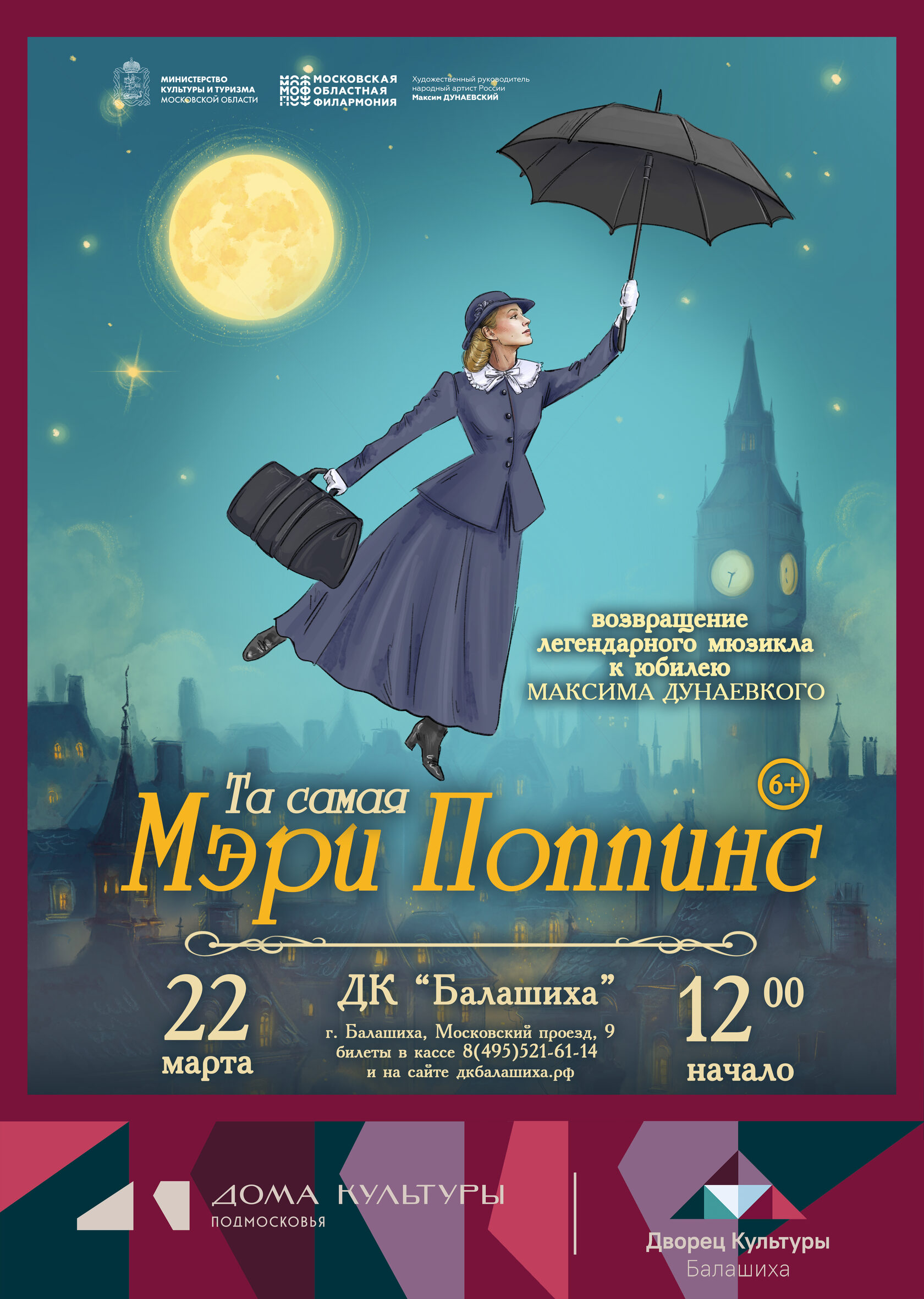Московская областная филармония объявляет о премьере музыкального театрализованного представления «Та самая Мэри Поппинс». Этот масштабный проект приурочен к юбилею народного артиста России, художественного руководителя филармонии, композитора Максима Исааковича Дунаевского и призван вернуть на сцену живое исполнение любимых мелодий из культового фильма «Мэри Поппинс, до свиданья».
